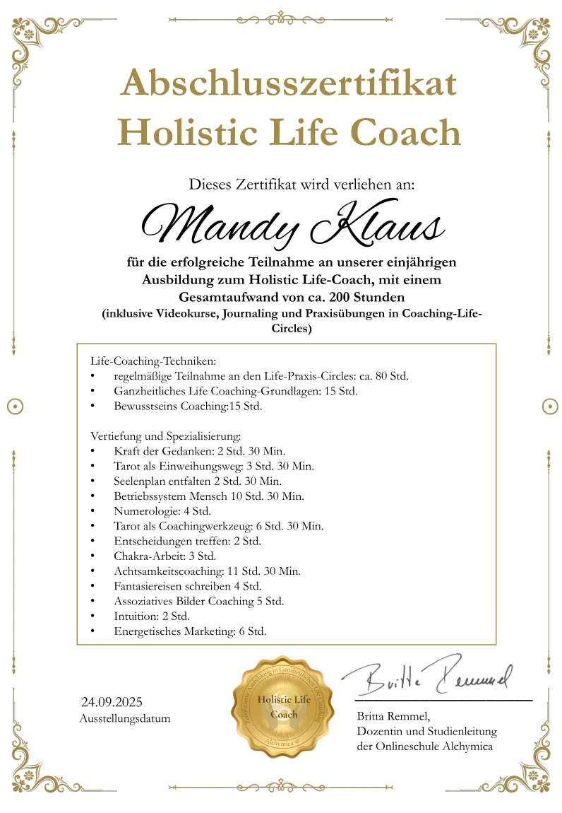 Aus diesem Grund habe ich das, was ursprünglich nur für meine Familie gedacht war, nun für alle meine Klienten zugänglich gemacht. Wir leben alle nur dieses eine Leben, dann darf es doch ruhig auch unser bestes Leben sein. Dabei unterstütze ich von Herzen gern.